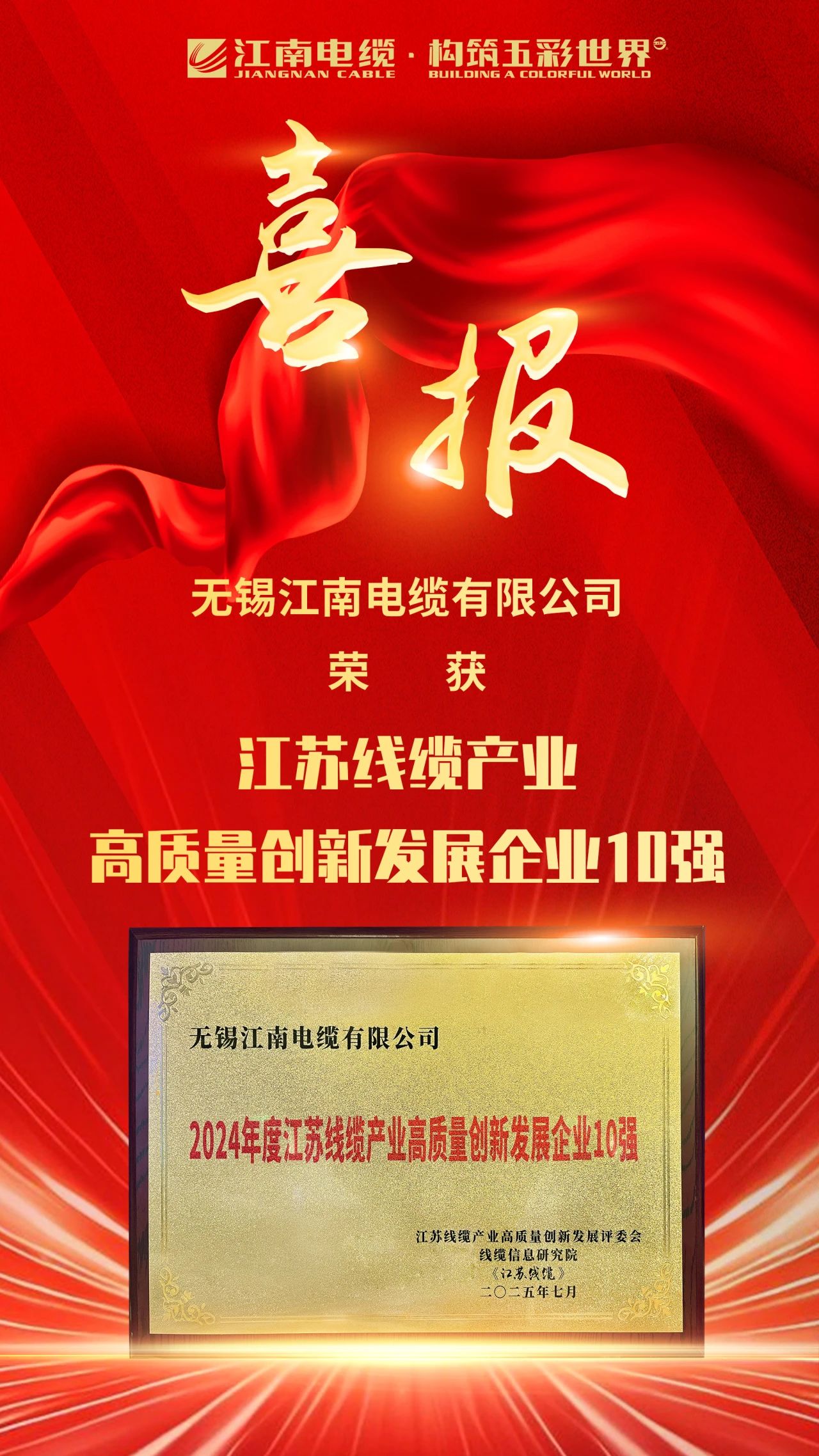 7月25日,江蘇省線纜行業(yè)高質(zhì)量發(fā)展峰會(huì)在南通隆重召開,會(huì)議發(fā)布了“江蘇線纜產(chǎn)業(yè)高質(zhì)量創(chuàng)新發(fā)展企業(yè)10強(qiáng)”、江蘇省電線電纜行業(yè)2024年度“科技尖兵/杰出工匠/優(yōu)秀經(jīng)理”等榜單。